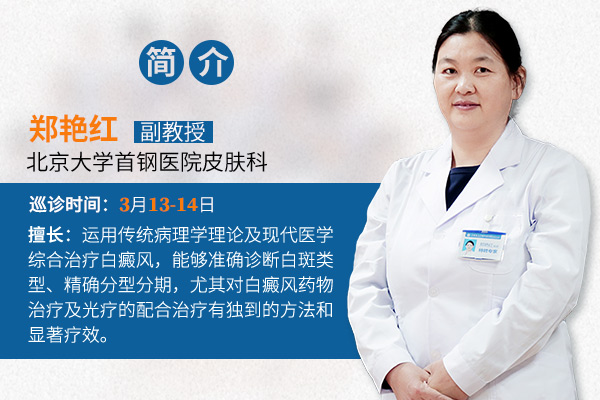 a 看白癜风就是看专家,特别是对初发不明白斑的患者。因为临床上易与白癜风混淆的皮肤病较多,而经验丰富的白癜风医生能够准确、科学的鉴证白斑类型。本周未(3月13-14日)北京大学首钢医院郑艳红副教授将与中研多位白癜风医生开启联诊机制,现场出具多对一、精细化的个性化诊疗方案。